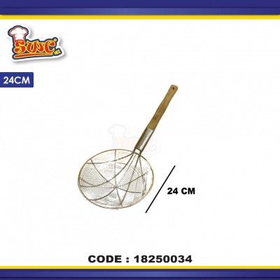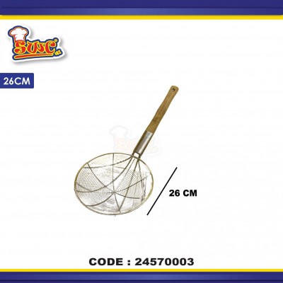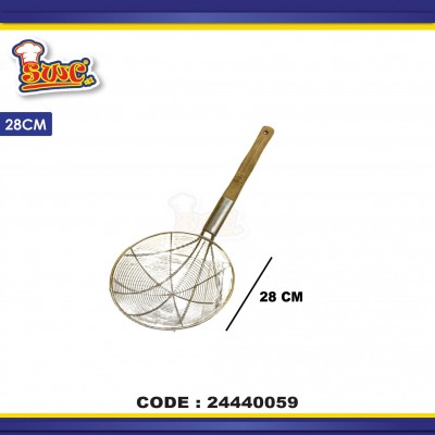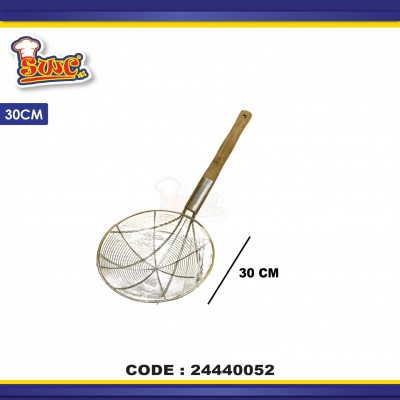 Long wooden handle stainless steel wire skimmers with modern design, ideal for restaurant and home kitchen use. Features include eco-friendly materials, all-season usability.